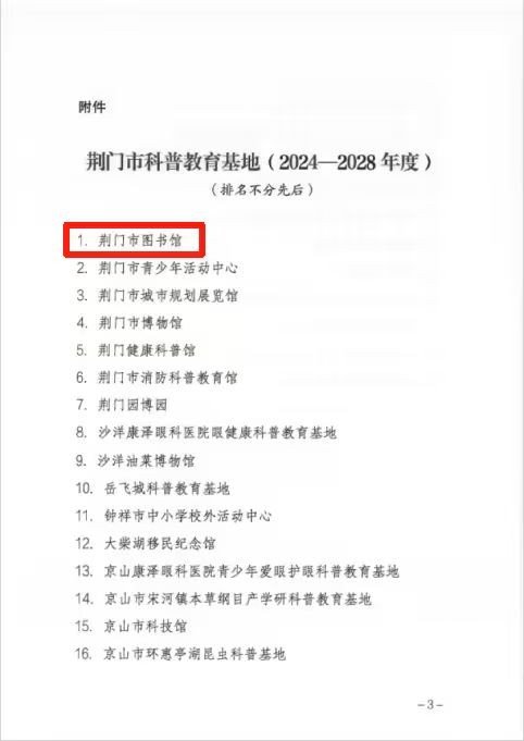 8月29日,荆门市科学技术协会下发了《关于命名“荆门市科普教育基地(2024-2028 年度)”的通知》,荆门市图书馆被认定为“2024-2028年度荆门市科普教育基地”。