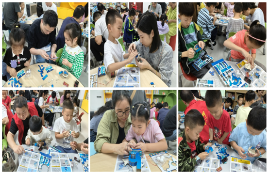 进入最令人期待的动手制作环节时,孩子们兴奋不已。在主讲老师和文化志愿者的耐心指导下,家长和孩子们一起按照步骤认真组装“涡轮悬浮球”的各个部件。裁剪、拼接、安装…… 整个过程中,亲子间默契配合,志愿者和老师也从旁提供帮助,现场欢声笑语不断。