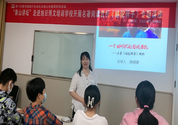 阅读作为人类基本的认知活动,它会定义、构建和不断丰富个人的精神世界。为进一步提高全民阅读积极性,营造全民参与、全民受益的浓厚氛围,推动全民阅读活动的深入开展,5月28日,荆门市图书馆“象山讲坛”走进市旭日博文培训学校,举办了名著阅读赏析《骆驼祥子》专题讲座,带领读者们感受一次深刻而愉悦的阅读体验。