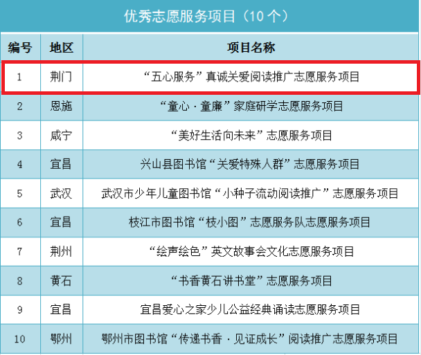 3月17日,第七届长江读书节“十佳评选”获奖名单揭晓,荆门市图书馆创办的“五心服务”真诚关爱阅读推广志愿服务项目,获得“十佳优秀志愿服务项目”荣誉称号。