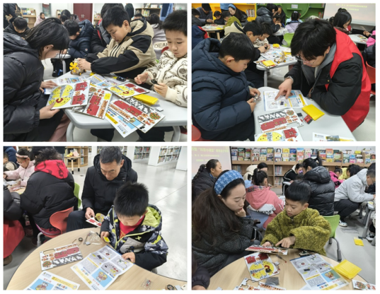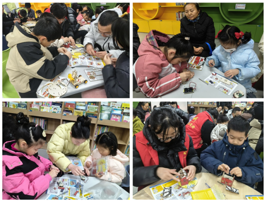 在老师与文化志愿者的共同指导下,亲子家庭携手制作“新年小院”手工作品,细心完成拼接与调试。现场氛围紧张而温馨,孩子们认真尝试,家长们从旁协助。
