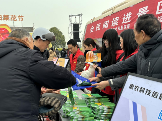 活动现场,市、县两级图书馆以花为媒、以书会友,设置流动图书服务点、全民阅读推广、文化科普宣传、农家书屋指导等便民服务板块,精心准备农业科技、生活保健、地方文史等各类电子图书,免费供群众与游客阅览。工作人员现场发放《兴农荟萃》等宣传手册,推广数字阅读资源和最新的种、养殖技术,讲解办证、借阅、线上看书等便民服务流程,让群众在赏花踏青之余,就近享受便捷的“文化大餐”。